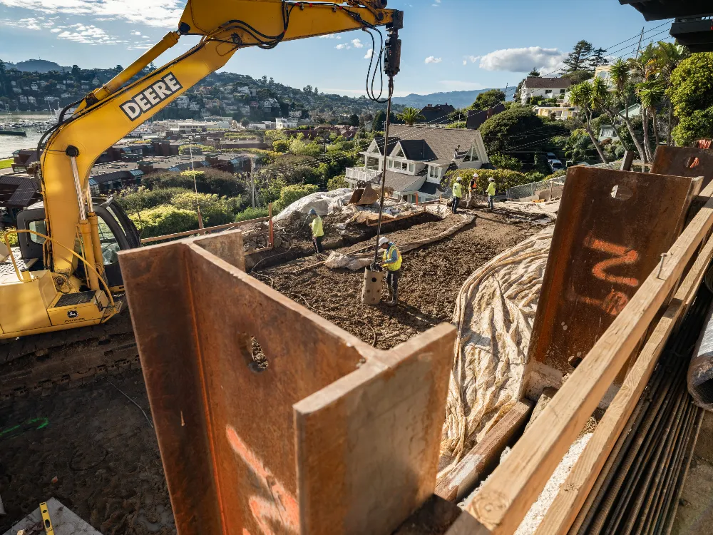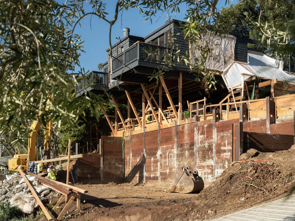 Once stabilized, a significant excavation will be performed to accommodate a 14-foot-tall retaining wall spanning the full width of the residence, creating the foundation for a new garage and accessory dwelling unit (ADU) at the newly formed lower third level.