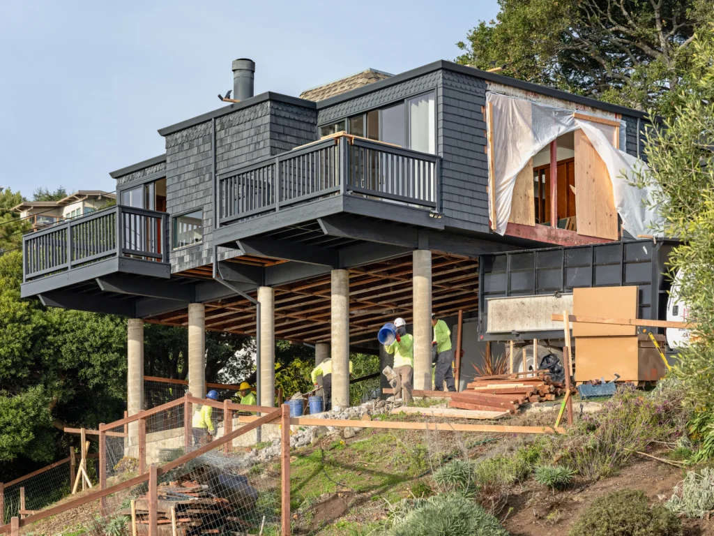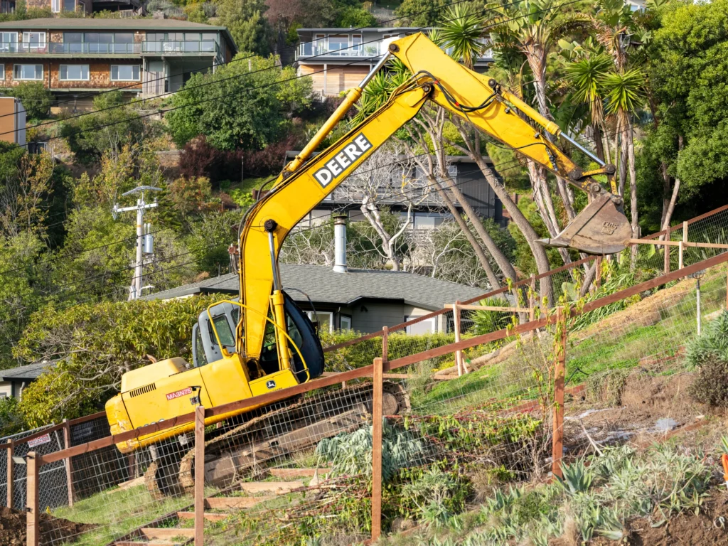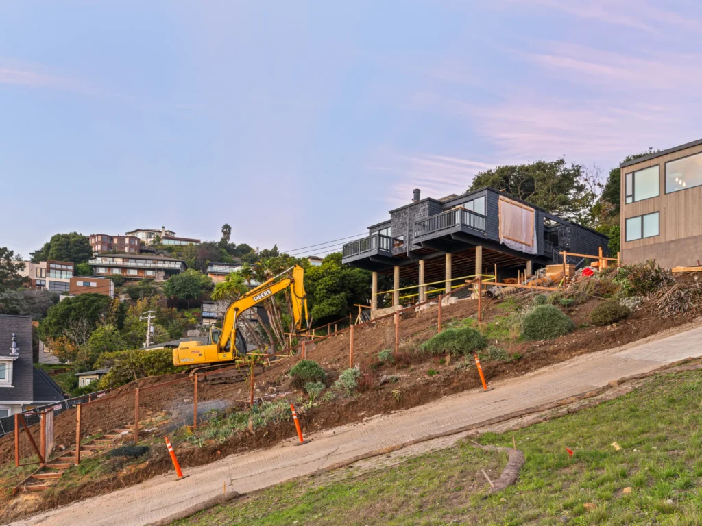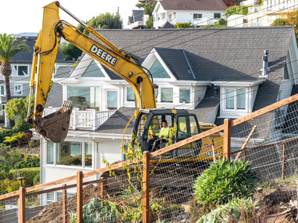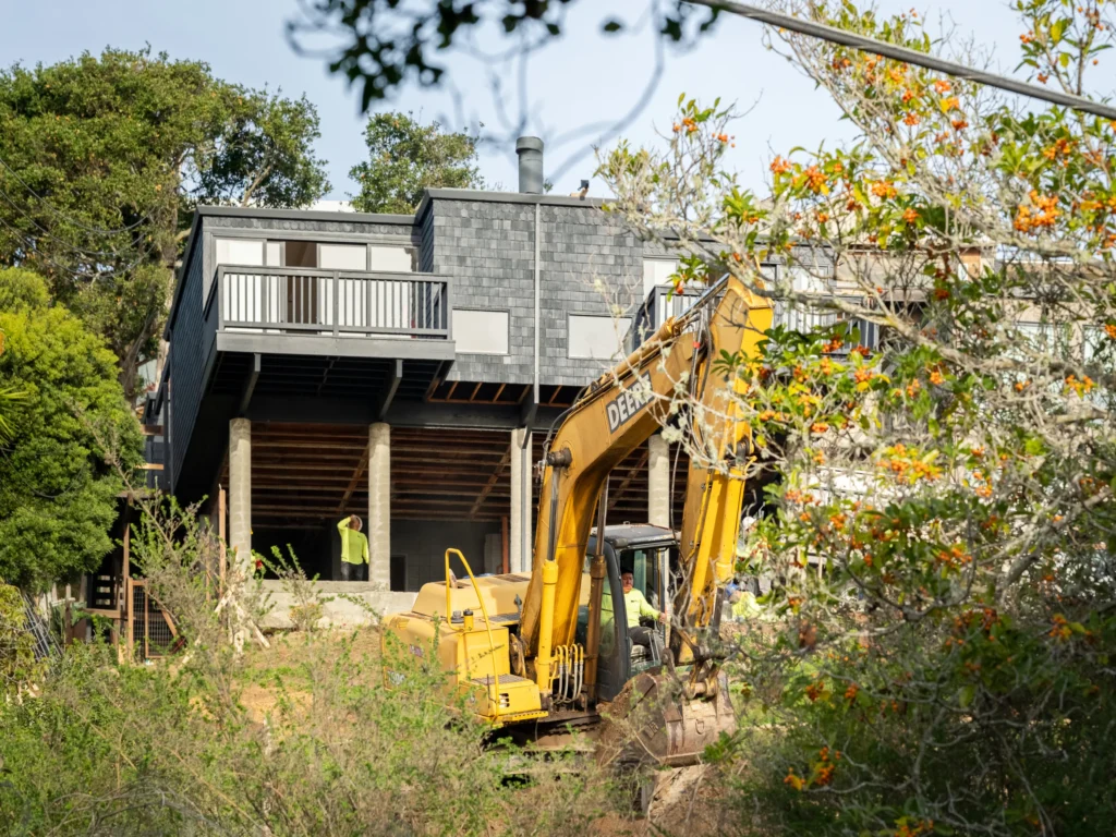 Outside, preparations are underway for the new foundation. The process begins with removal of the existing driveway slab, which clears the space needed to install temporary shoring to support the existing structure. From there, the hillside will be stabilized, enabling deeper excavation for the new lower levels, including the garage and ADU.