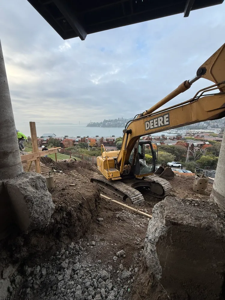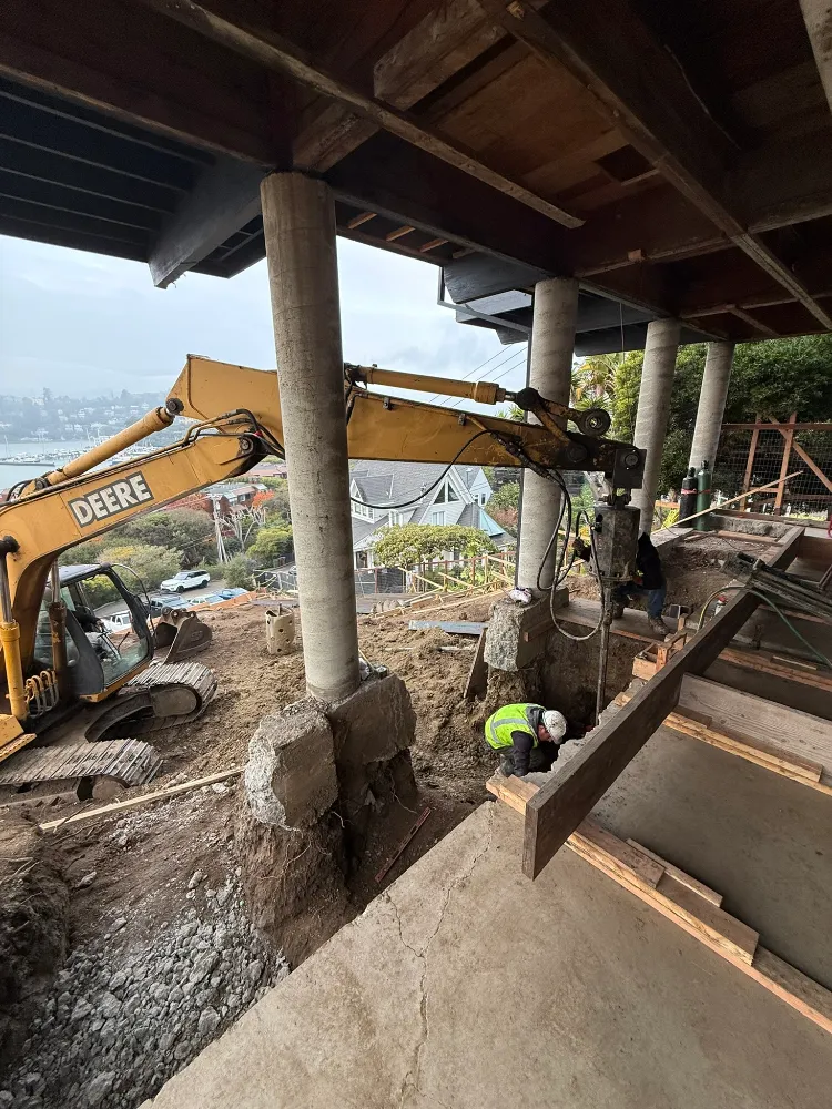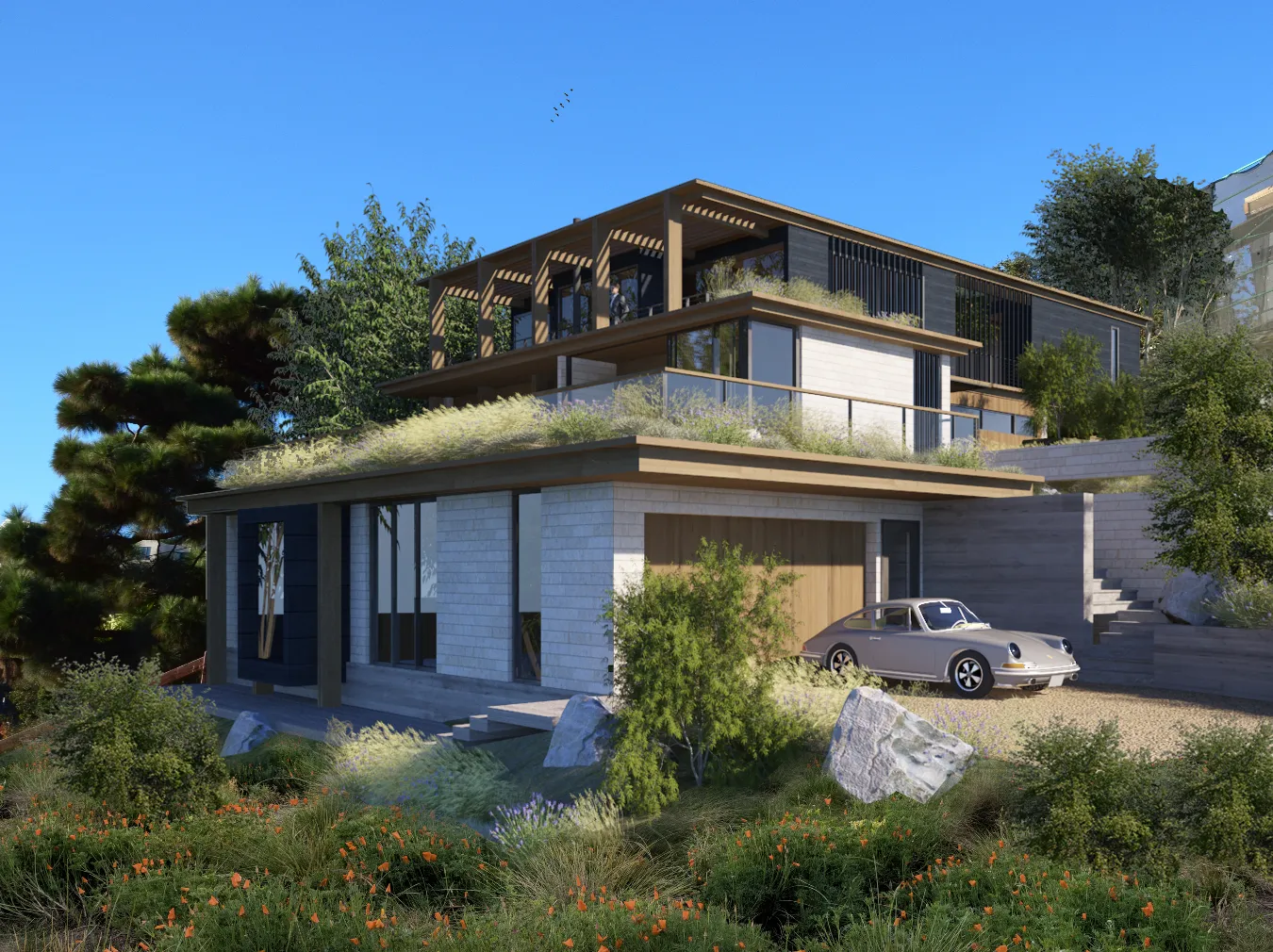 Once stabilized, a significant excavation will be performed to accommodate a 14-foot-tall retaining wall spanning the full width of the residence, creating the foundation for a new garage and accessory dwelling unit (ADU) at the newly formed lower third level.